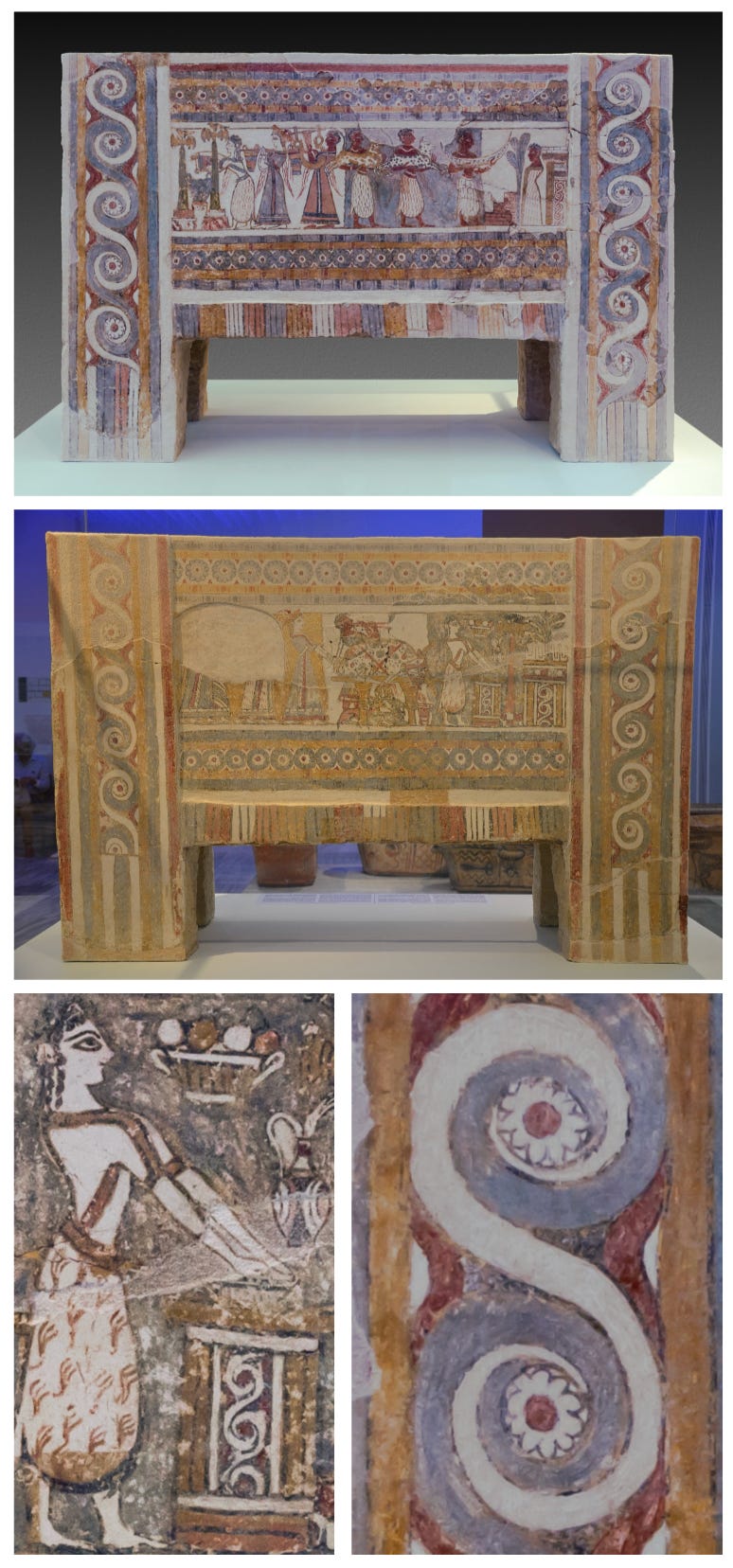 One of the uses of small, handmade “cakes” in the ancient world was to eat, of course, but another was as an offering. Ceremonial cakes were used by the ancients along with other food sacrifices, to please gods or as a part of rituals. And there is one Minoan archeological find that is of interest to us: it is from the site named Haga Triada, where a spectacular sarcophagus was found, dating to around 1350 BC. The sarcophagus is brilliantly painted on all sides with a fresco of a funeral procession. Most of the figures are bearing offerings of sacrifice: animals including a bull and goats, a bull’s horns, jugs of wine (or blood), and one image of a dish of what is thought to be small cakes. These cakes are round, not S shaped, however. But look at the curlicue decorations elsewhere on the sarcophagus- they resemble exactly the shape of koulourakia. Is this the origin of the supposition that the Minoans invented snake-shaped cakes?